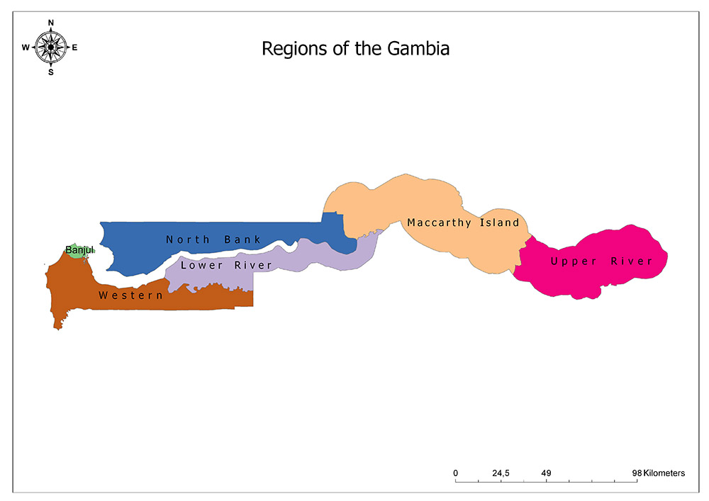 The Gambia is divided into six regions. At the same time, these regions are called “division” since 2007. These regions are Banjul, Western, North Bank, Lower River, Central River (Maccarthy Island) and Upper River.