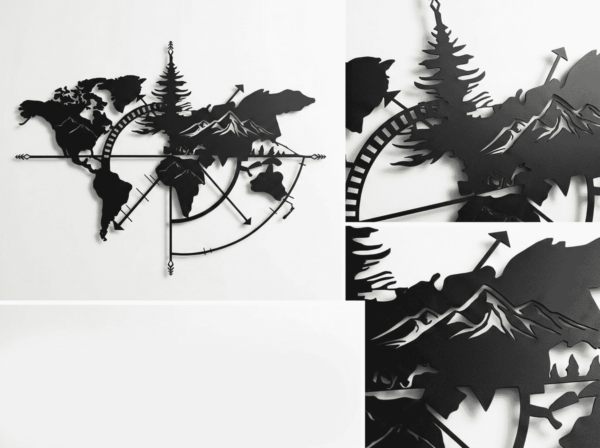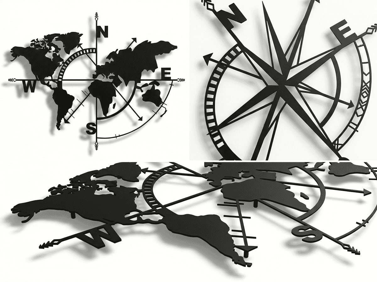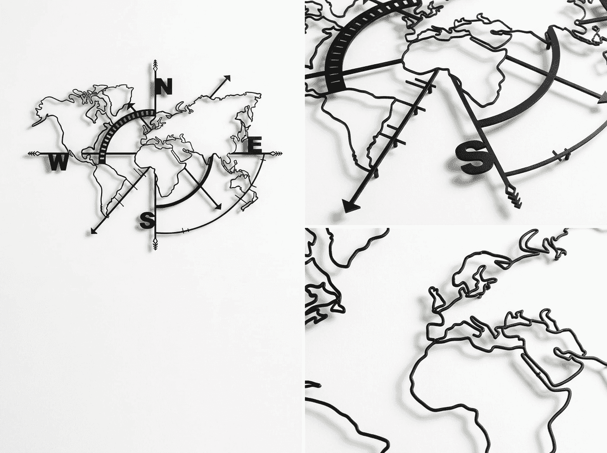Simple silhouettes (DEKADRON Classic, Hencely) suit minimalist and Scandinavian interiors. Compass designs add a nautical edge. Geometric and mountain variants bring texture and visual complexity. Globe formats work for modern and eclectic spaces. Match the map’s personality to your room.