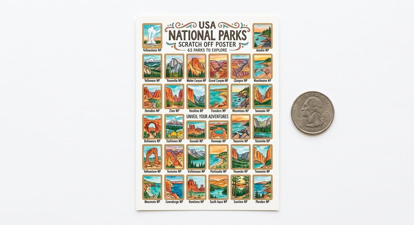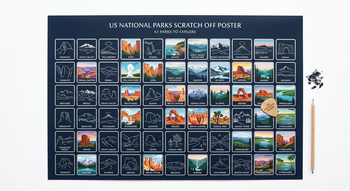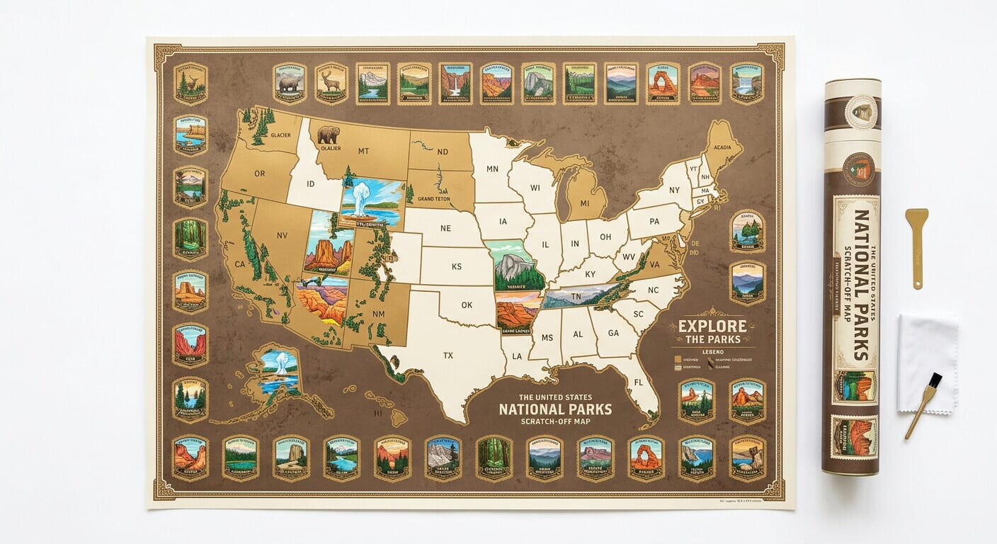 National parks scratch off maps let you track your visits across America’s 63 national parks by scratching away a foil layer to reveal colorful illustrations, photographs, or detailed cartography underneath. They double as wall art and travel motivation — a visual bucket list that grows more colorful with every trip.
