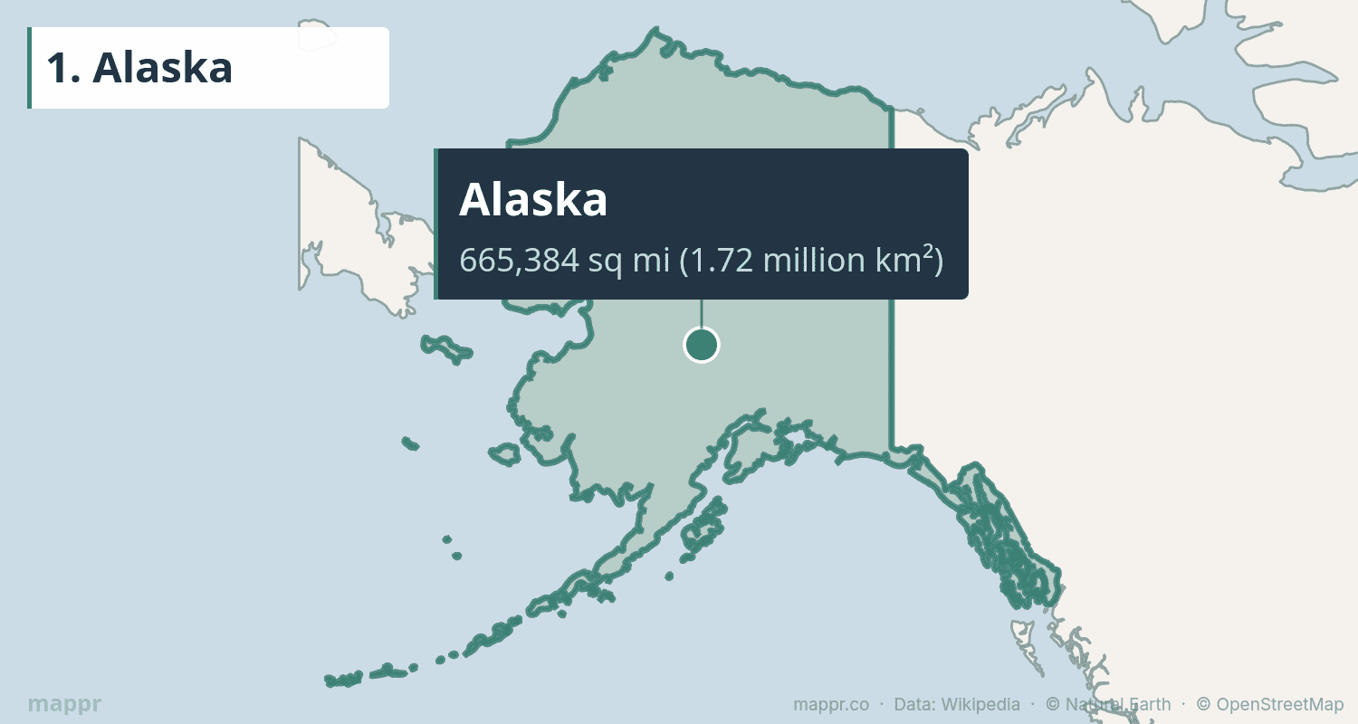 - Alaska (665,384 mi²) is by far the largest state — 2.4× bigger than Texas and larger than the next three states combined.