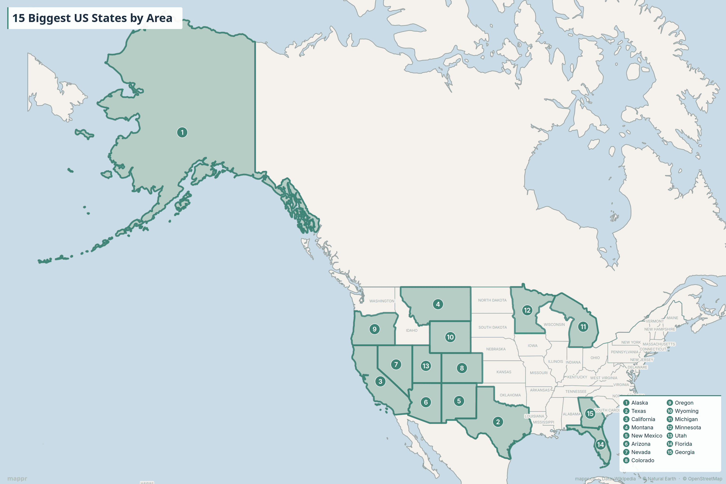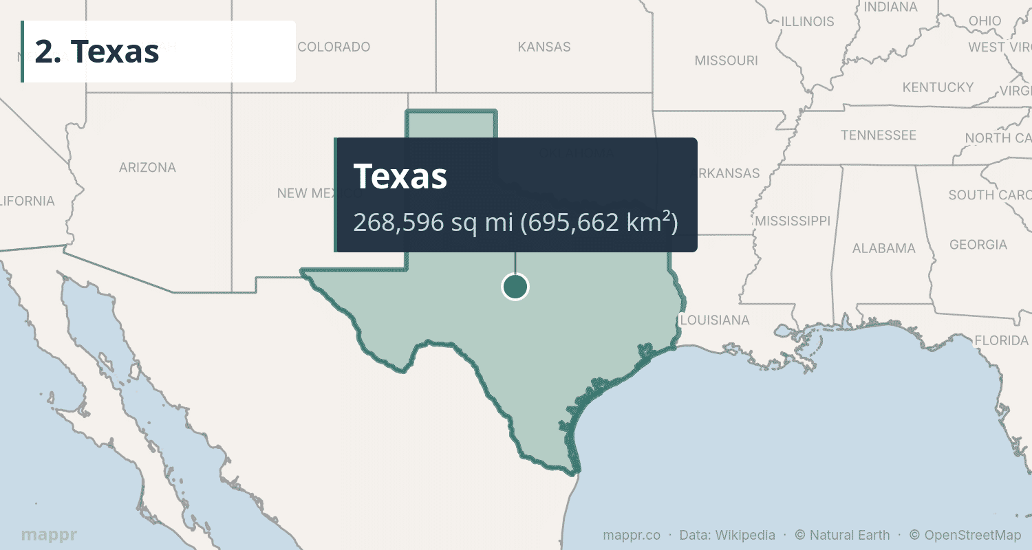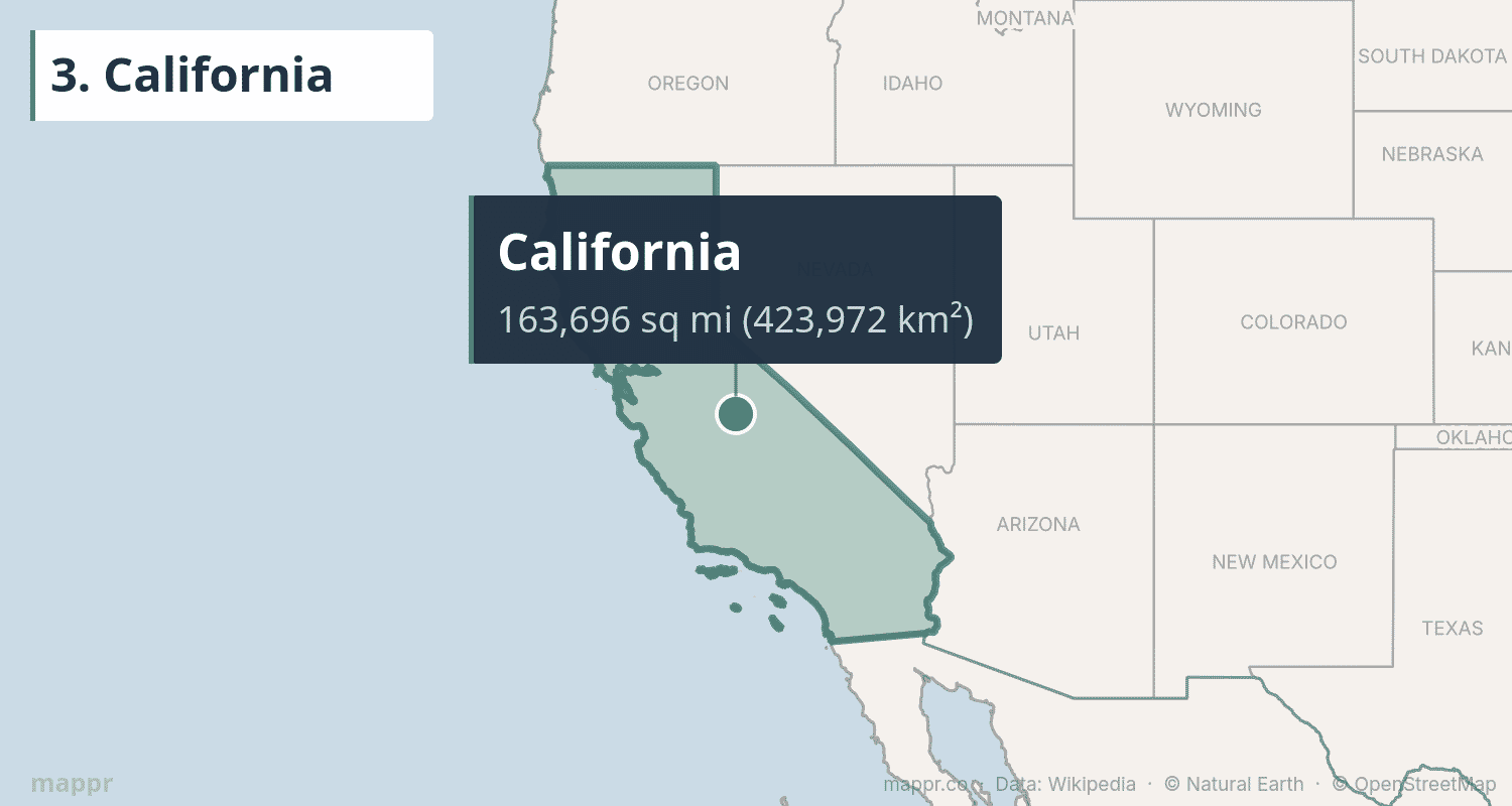 - Western states dominate: 11 of the 15 biggest states are in the American West, where federal land ownership is high and population density is low.