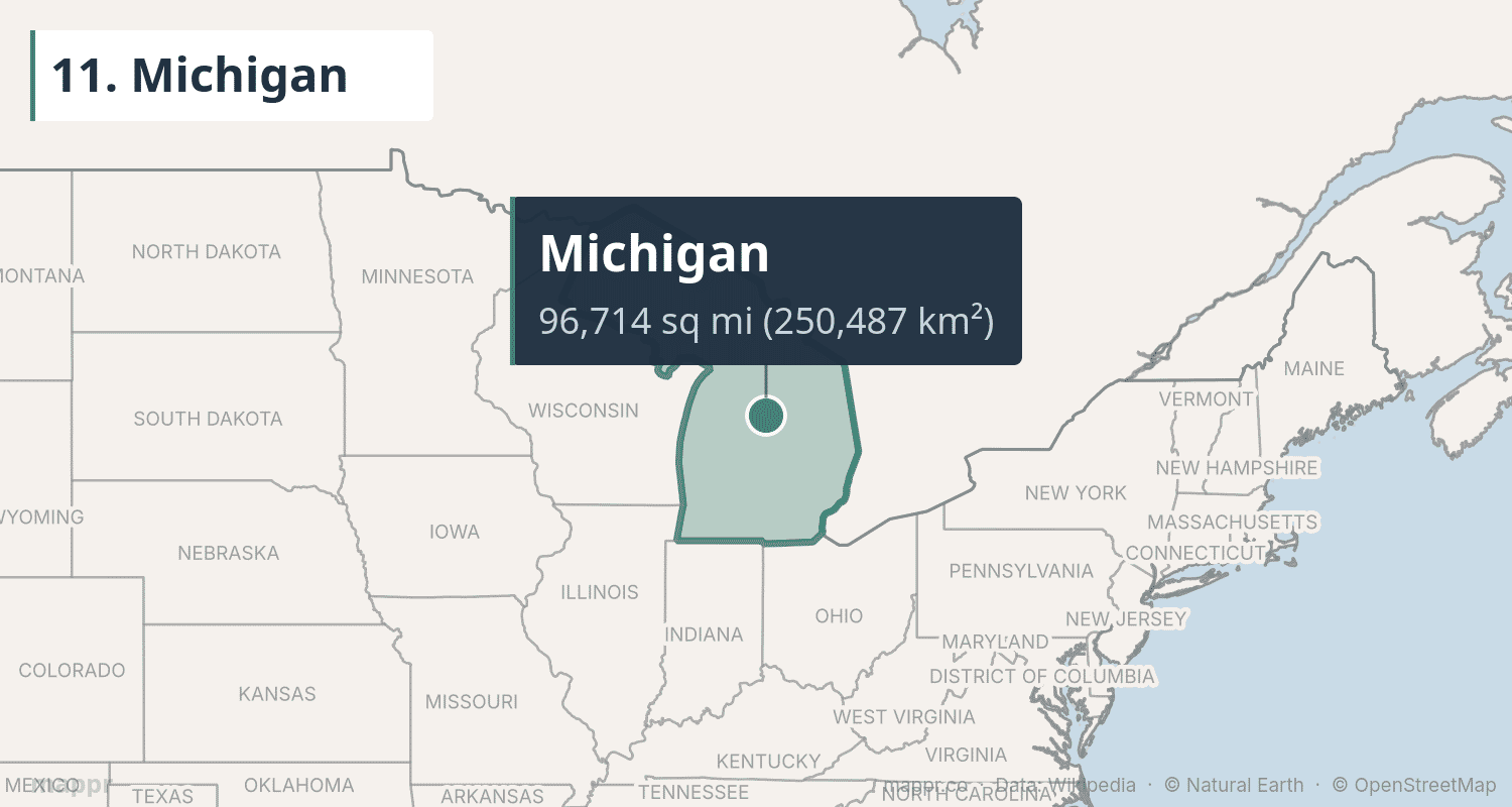 - Michigan ranks 11th despite being in the Midwest — its area is boosted by the Great Lakes waters within its borders.