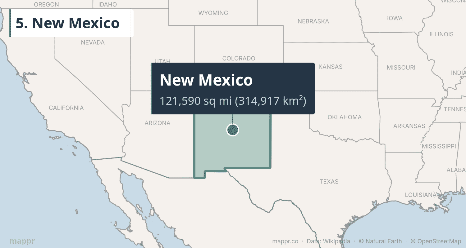 | 5 | New Mexico | 121,590 | 314,917 | Santa Fe | Mountain |