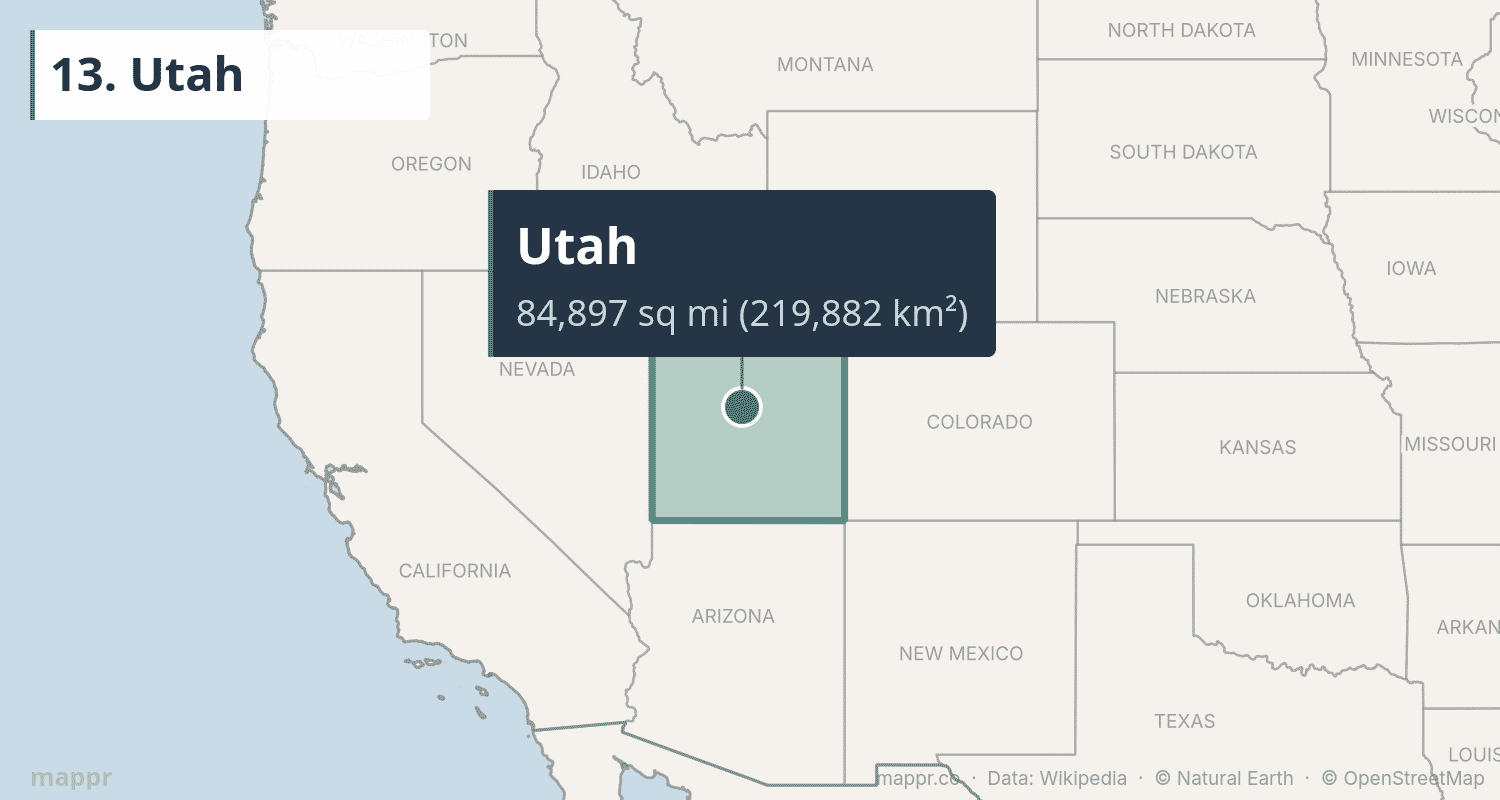 | 13 | Utah | 84,897 | 219,882 | Salt Lake City | Mountain |