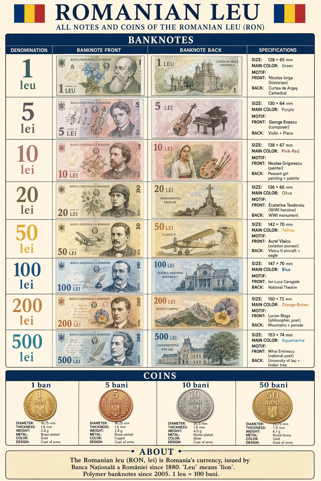 Romania’s current banknote series is unusual: polymer notes, making it the first EU country to issue all banknotes on polymer (since 2005). Each denomination honours a 19th or 20th-century Romanian cultural figure — writers, composers, scientists, and painters dominate.