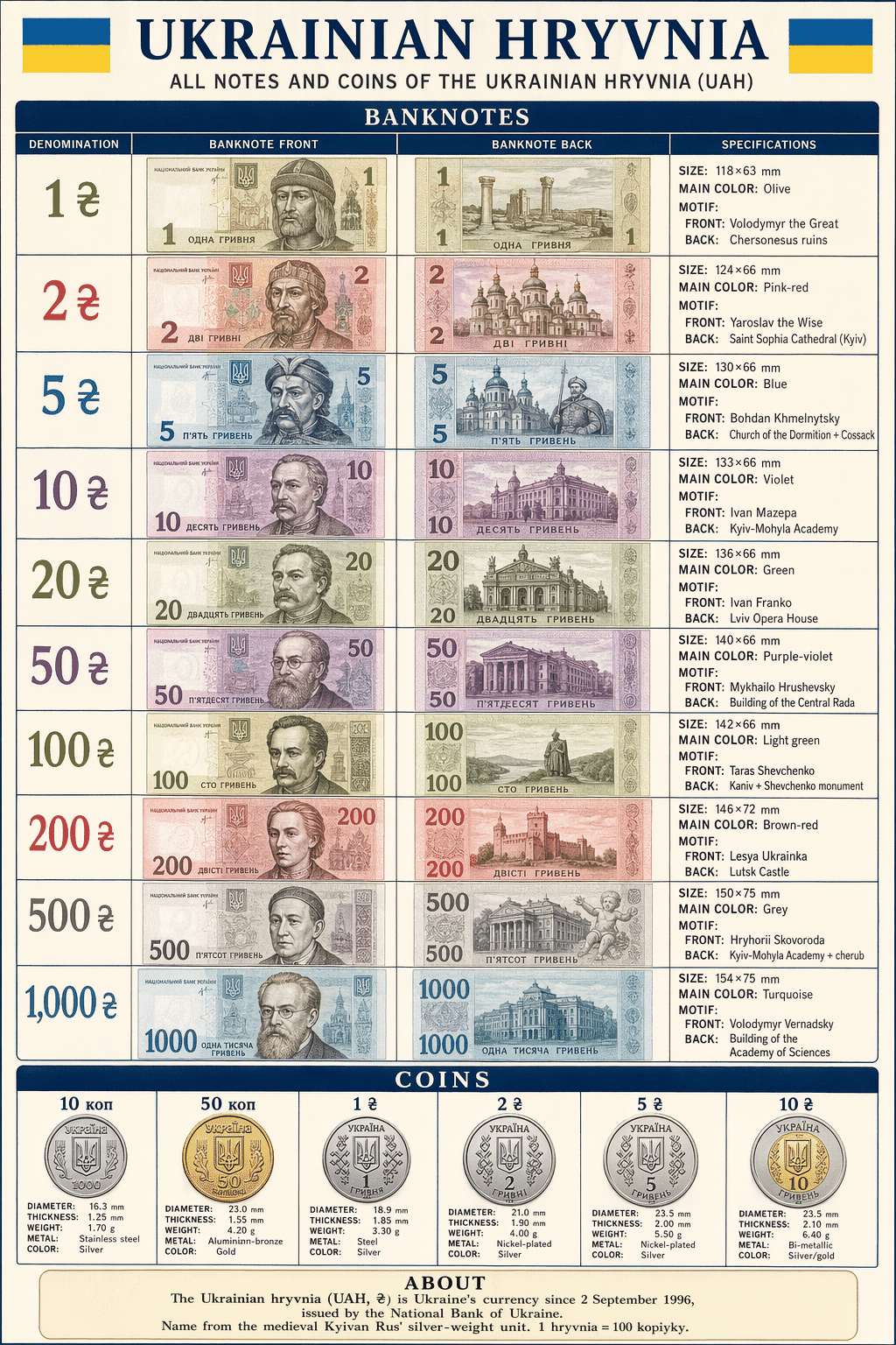 Ukrainian banknotes honour princes, hetmans, poets, and statesmen spanning a thousand years of Ukrainian history — from the medieval Kyivan Rus’ era to 20th-century figures.
