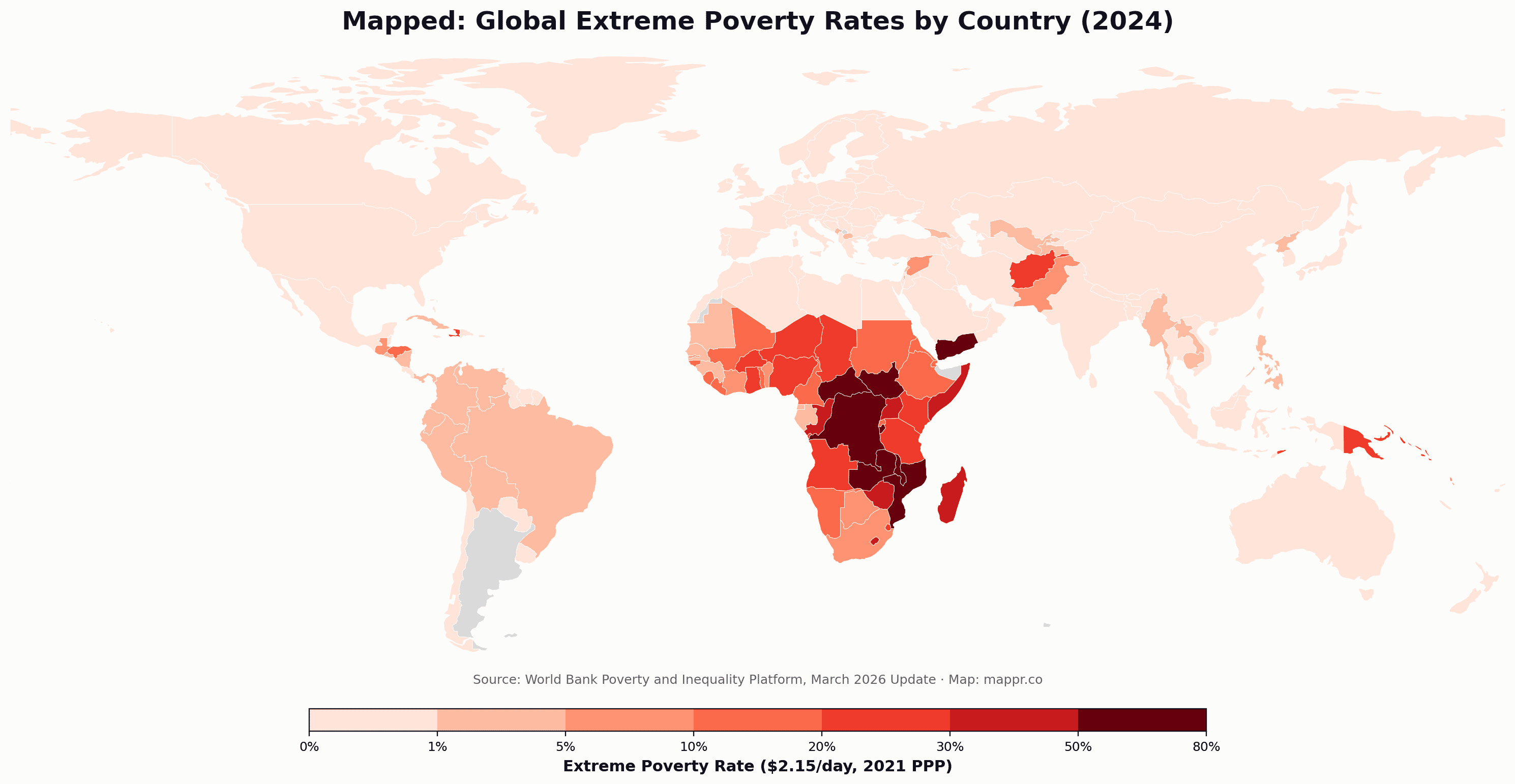 The map also highlights remarkable progress. Several countries have reduced extreme poverty to near-zero levels over the past three decades: