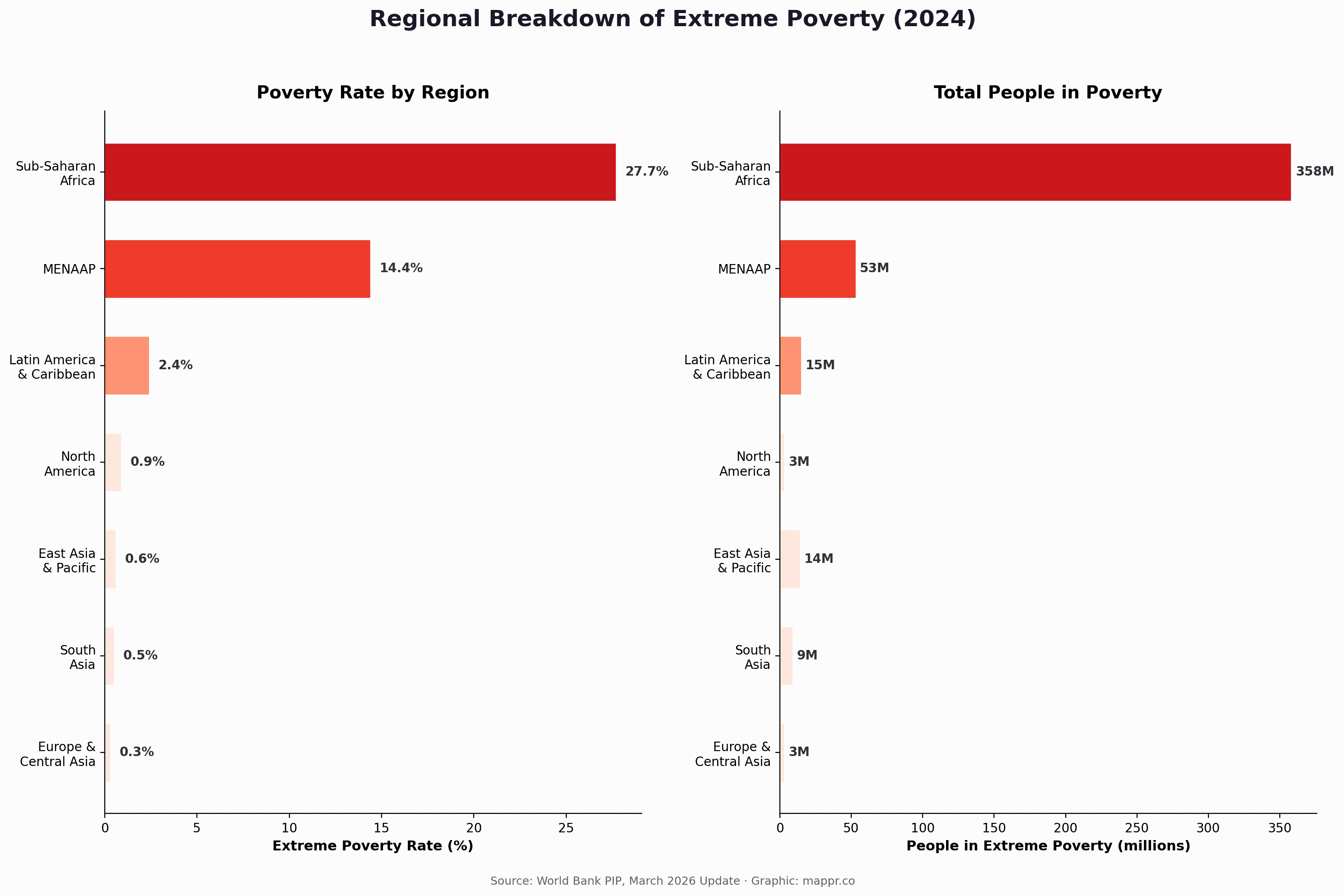 The data reveals a dramatic divide between regions. Sub-Saharan Africa accounts for 358 million people in extreme poverty—roughly 80% of the global total—despite having only about 16% of the world’s population. Meanwhile, regions like East Asia, South Asia, and Europe have reduced extreme poverty to below 1%.