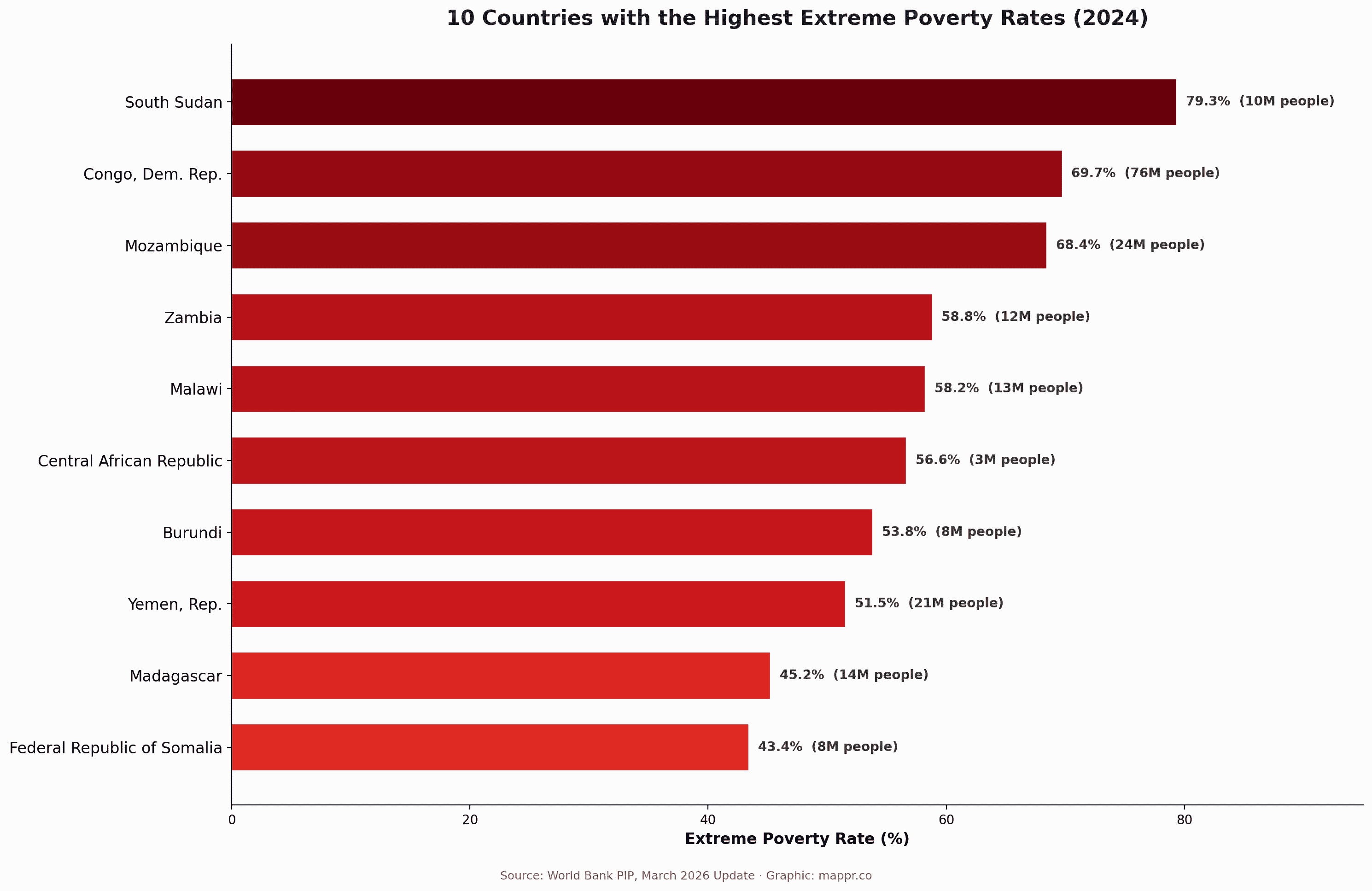 Nearly all countries with extreme poverty rates above 30% are in Sub-Saharan Africa, with Yemen as the only non-African nation in the top 10. The Democratic Republic of the Congo has the largest absolute number of people in extreme poverty—76.2 million.
