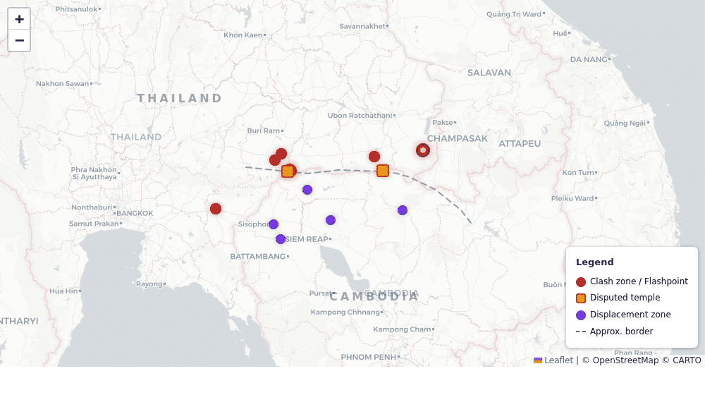 Explore clash zones, disputed temple sites, and displacement areas along the Thailand-Cambodia border. Click markers for details on each location.