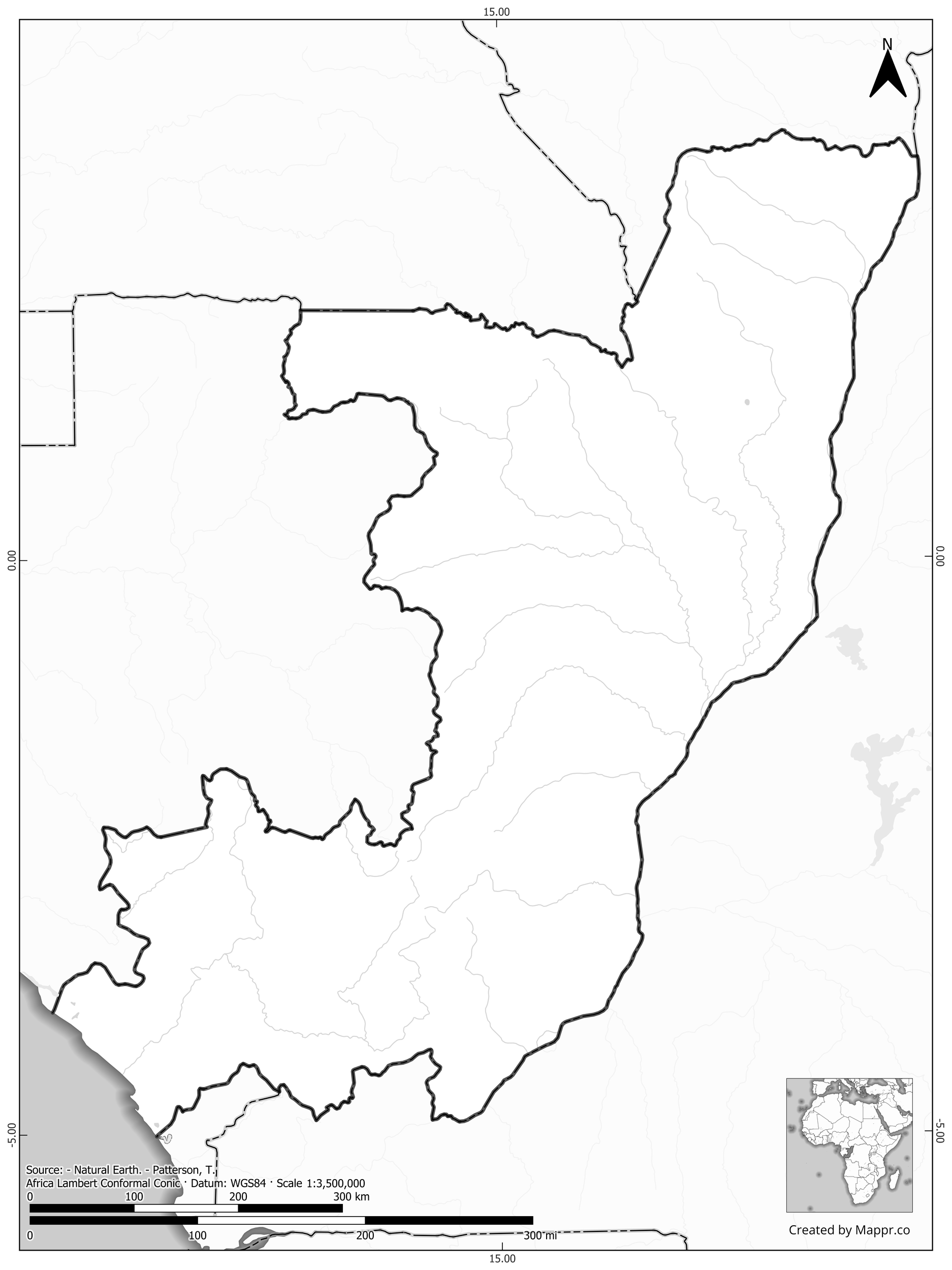 Black and white outline map of Republic of the Congo, perfect for print and educational purposes, highlighting