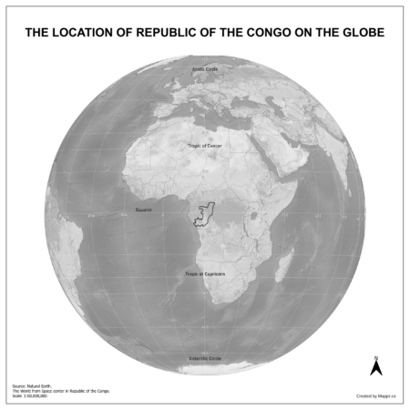 A black and white globe highlighting Republic of the Congo's location, showcasing its position on the African