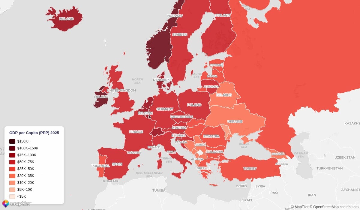 Map: GDP per Capita (PPP) in Europe, 2025