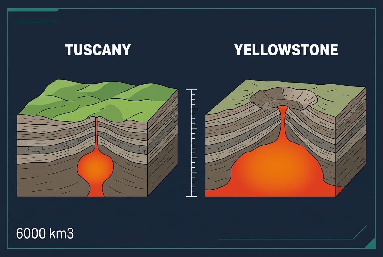 To put the volume in perspective: Yellowstone’s magma chamber holds an estimated 10,000–15,000 km³ of partially molten rock. Tuscany’s 6,000 km³ makes it one of the largest known magma accumulations in a continental setting — and the first of this scale identified in Italy outside of well-known volcanic zones like Vesuvius and Campi Flegrei.